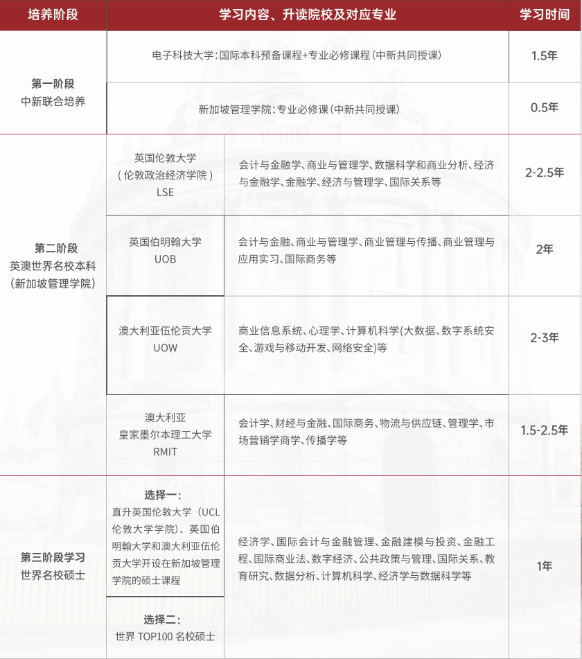 01、本硕连读,升学保障学员完成本科阶段学习后,可根据本科阶段成绩直升英国伦敦大学(UCL伦敦大学学院)、英国伯明翰大学和澳大利亚伍伦贡大学开设在新加坡管理学院的硕士课程,或以海本资格申请全球TOP100名校硕士,并获得优先录取。
